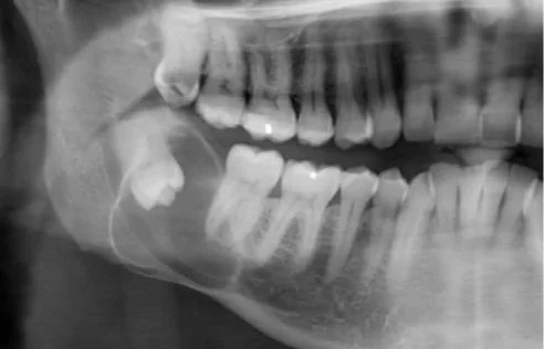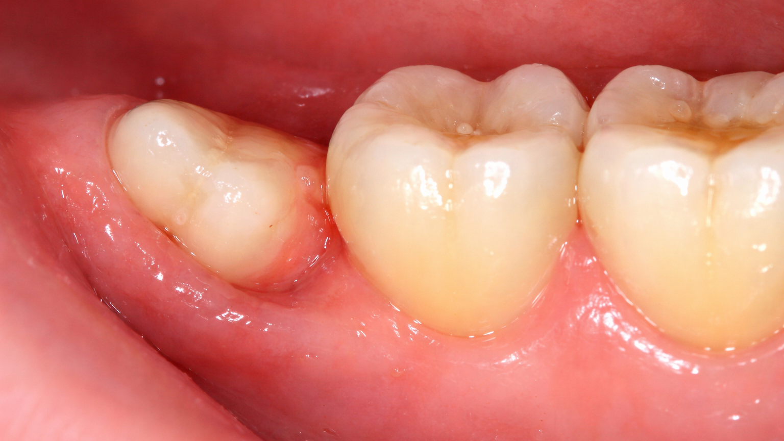 Image showing an impacted wisdom tooth pressed up against the second molar, with mild gum inflammation